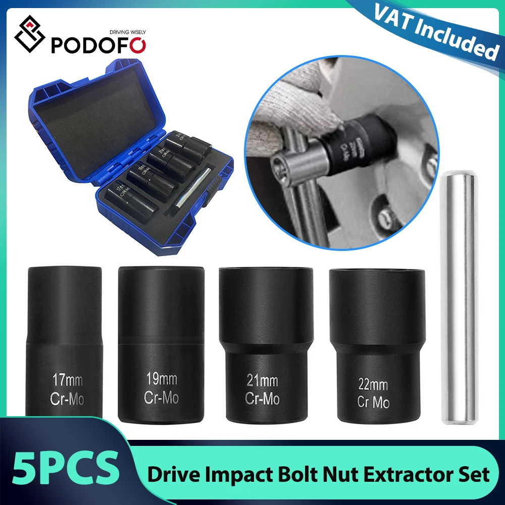 Podofo 5 stks Drive Impact Bout Moer Extractor Set Moer en Bout Extractor Moer Verwijdering Staaf Vergrendeling Wiel Wielmoer Remover 17-22mm