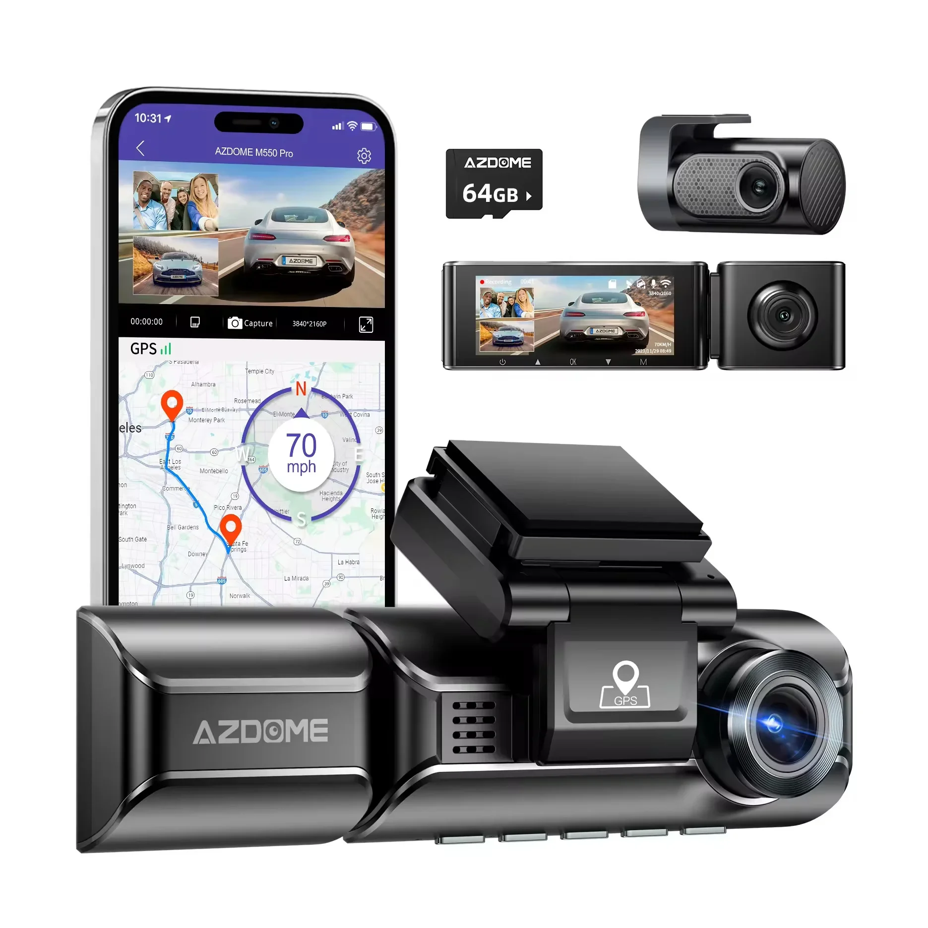 AZDOME Rijrecorder Drie Lens Recorder 2K+1080P+1080P Ingebouwde WIFI GPS Autotrajectregistratie