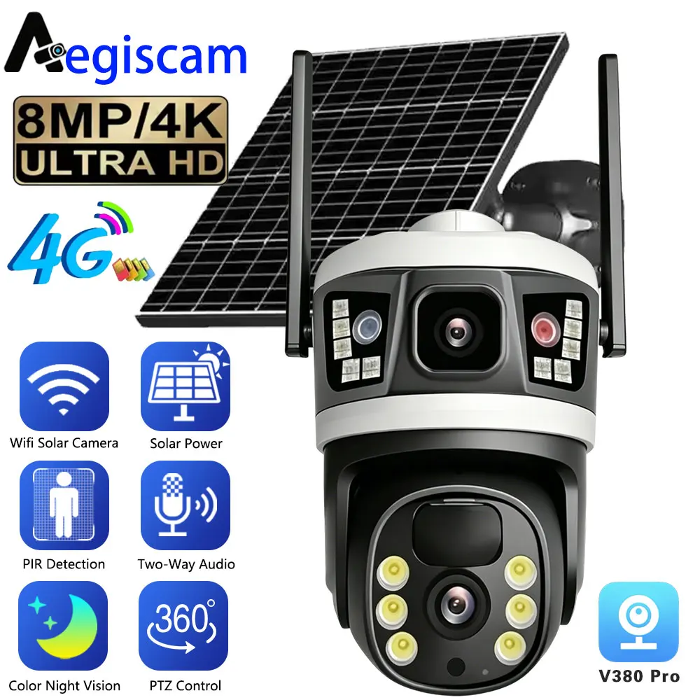 4G Solar Camera Buiten 8MP 4K Drie Lens Dubbele Schermen Beveiligingsvideomonitor Cam Kleur Nachtzicht Waterdicht CCTV IP Camera's