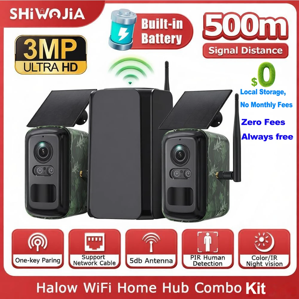 SHIWOJIA 2K 3MP Draadloos Zonne-energie Camerasysteem 4 Camera Kit Buiten WiFi Zonne-energie Beveiligingscamera Set 2-weg Communicatie Geen Kosten Altijd gratis
