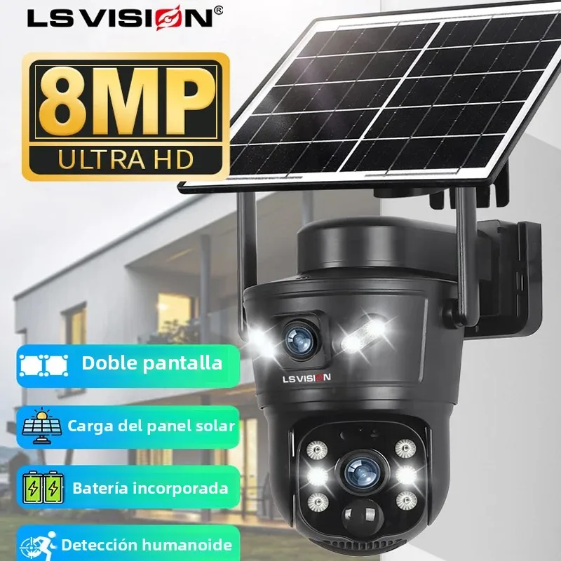 LS VISION 8MP 4G zonnecamera dubbele lens 2-schermen WiFi PTZ automatische tracking waterdichte panoramische bewakingscamera met batterij