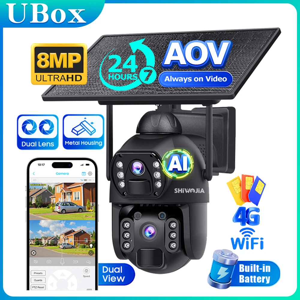 SHIWOJIA 8MP zonnecamera dubbele lens AOV 24-uurs video-opname beveiligingscamera 4G LTE wifi-netwerk 2100mAh batterij Auto Trackin