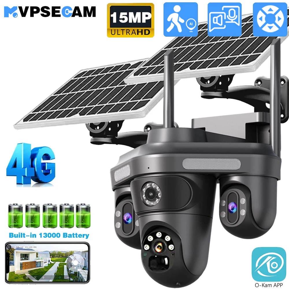 Ingebouwde 13000 batterij 15MP 4G Solar PTZ-camera Dubbele zonnepanelen voor buiten 8K Drie lenzen Tweeweg audio CCTV PIR-detectie O-Kam