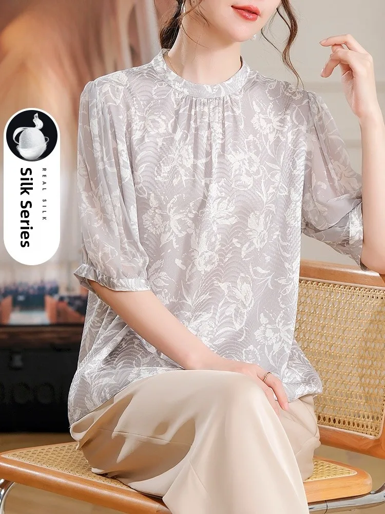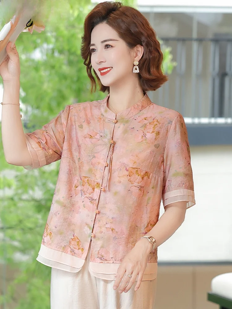 Ele zijden overhemd voor vrouwen van middelbare leeftijd, zomer, zwaargewicht, bedrukt zijde, losse pasvorm, knoopsluiting, korte mouw, Nieuw