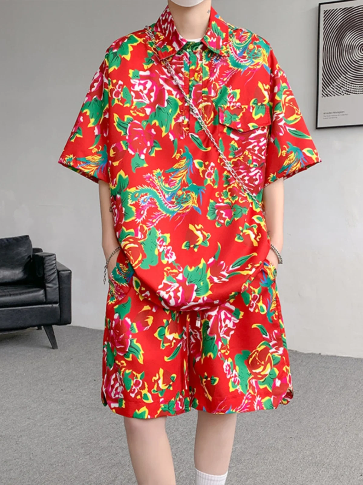 Noordoostelijke Big Flower korte broekset zomer dunne heren ijszijde korte broek tweedelige set Haome paar outfit