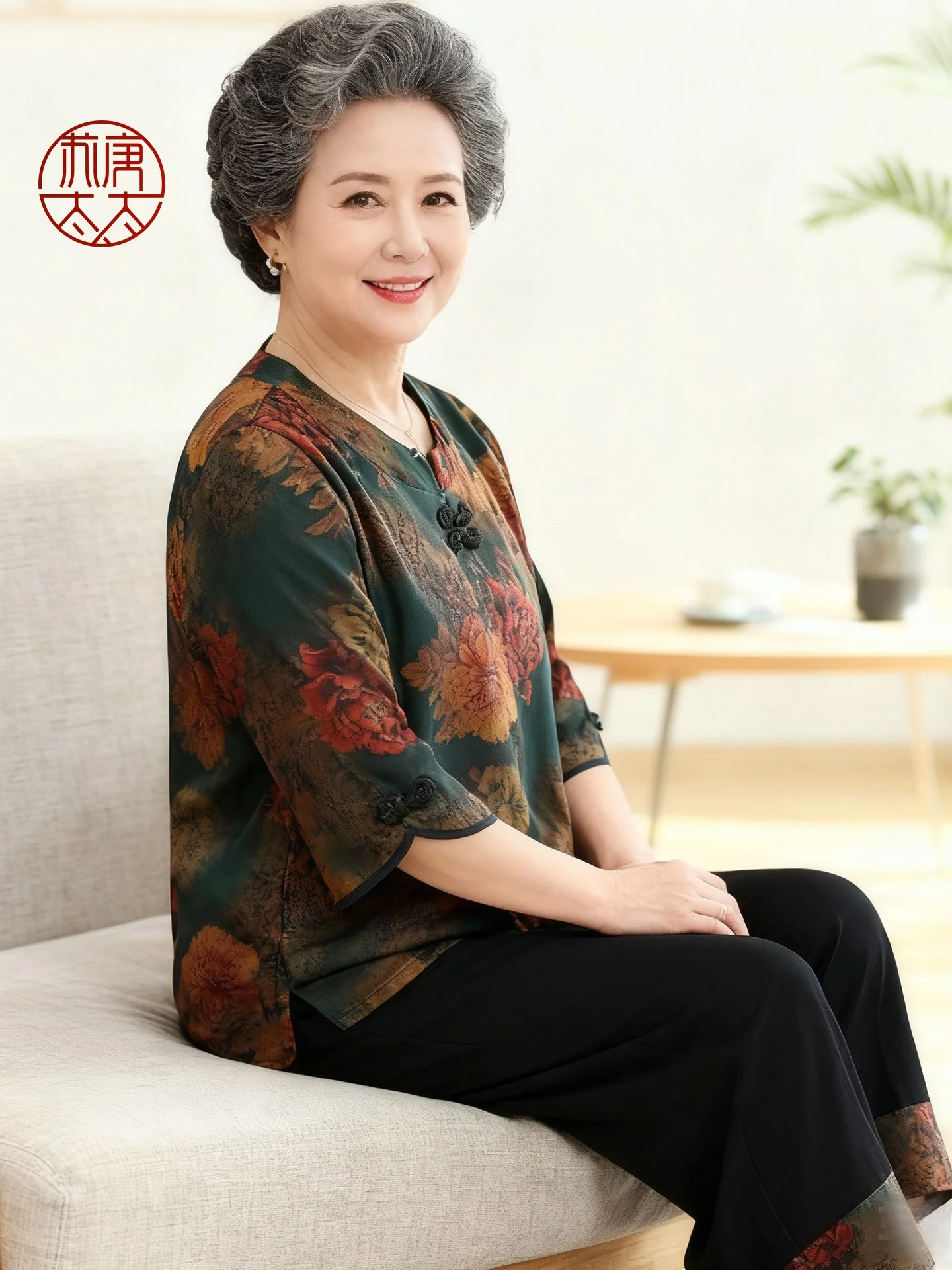 Zomerse loszittende set met zijdeachtig gevoel voor dames, traditionele Chinese pioenroosprint, comfortabel dun T-shirt en broek