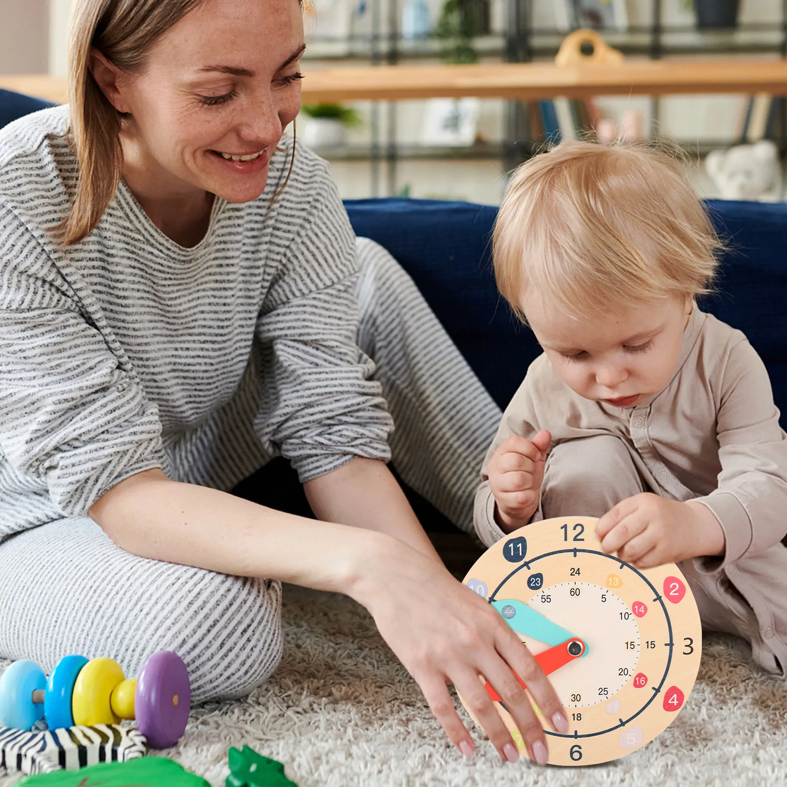 Kleurrijke houten kinderhorloge met cijfers, educatief cartoonhorloge voor het leren van de tijd, cognitie en het ontwikkelen van logisch vermogen bij kinderen