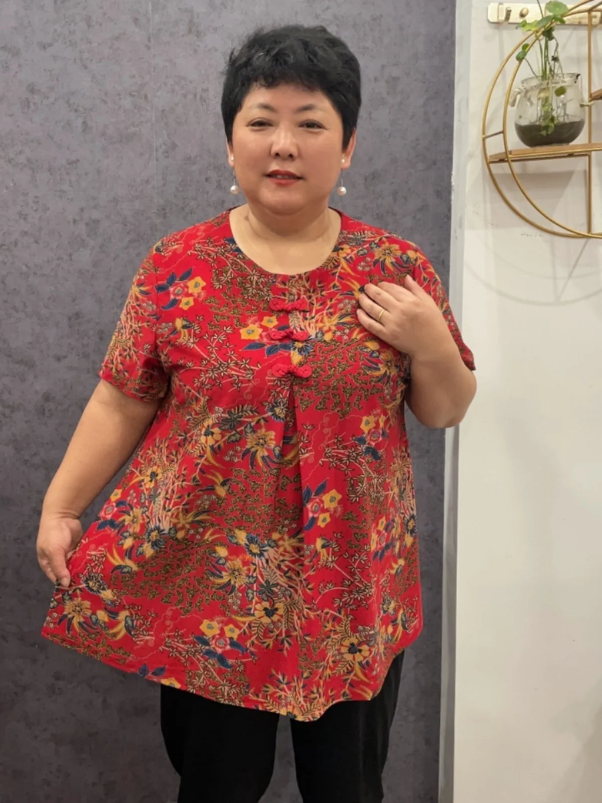 Plus Size 220 Pou Sneeuwzijde Gedrukt Knoop Mommy's Zomer Casual Loose Fit Korte Mouw Ronde Hals T-shirt voor dames