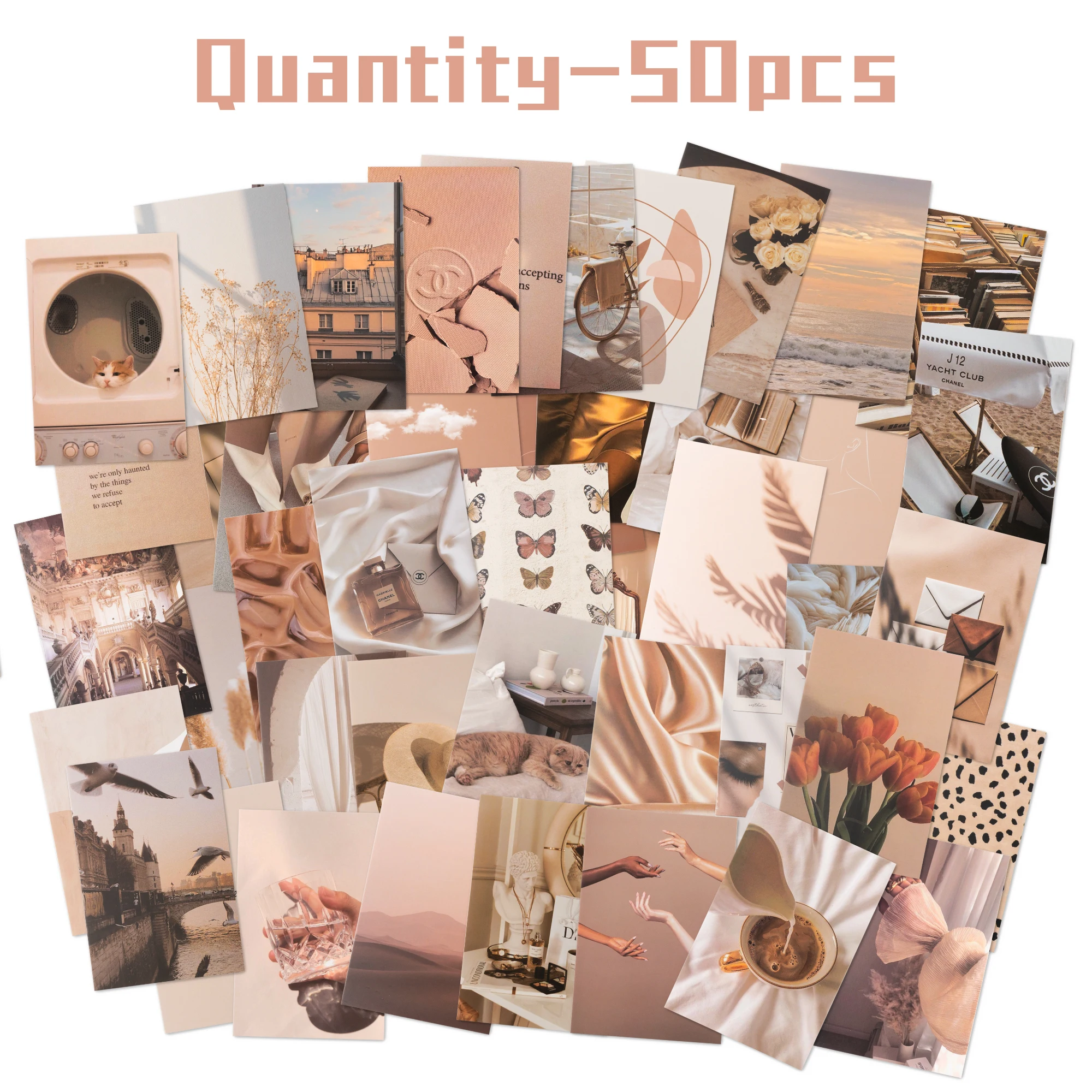 50 stuks Boho Collage Kaarten Set Beige Neutrale Tinten, Niet-Klevende Papier Uitsnijdingen voor Wanddecoratie, Scrapbooking Rustieke Huisdecoratie