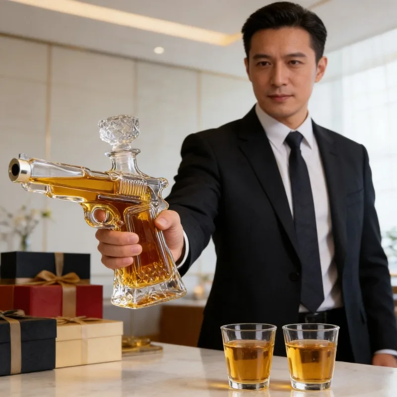 Pistoolvormige whisky decanterset met shotglazen in de vorm van kogels - Uniek wapenthema huisbar decoratie & dranken dispenser cadeau voor mannen