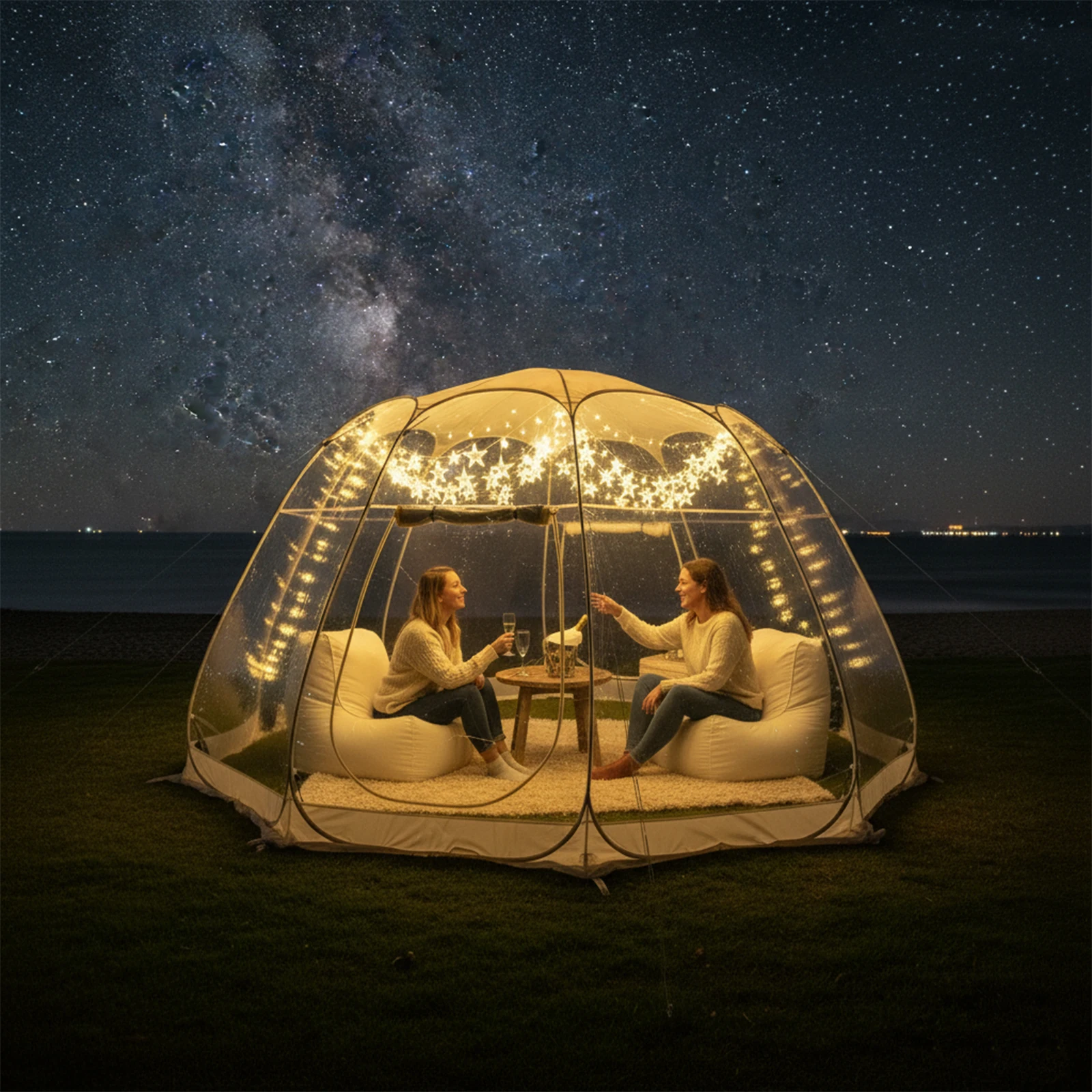 Snel op te zetten bubbeltent campingpod, winddicht, koudebestendig, PVC buitenverblijf, inclusief lichtsnoeren voor een sfeervolle avond.