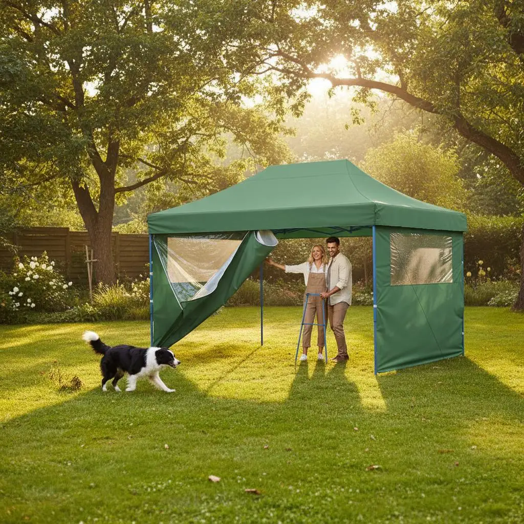 Opvouwbare feesttent met 3 zijwanden, groen, ideaal voor evenementen, festivals en feesten.
