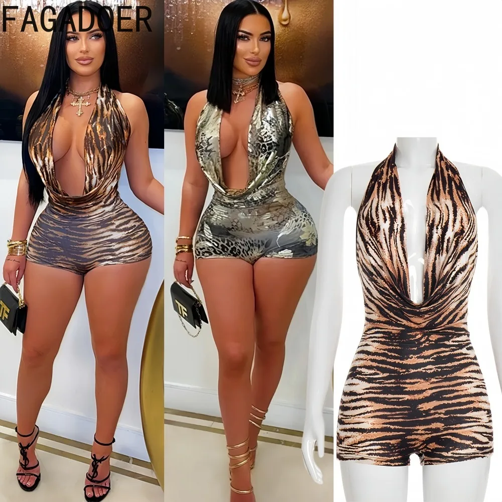 FAGADOER Sexy Halo Tijgerprint Bodycon Rompertjes voor Vrouw Halter Diepe V-hals Backless Jumpsuits Vrouwelijke Streetwear Overalls 2026