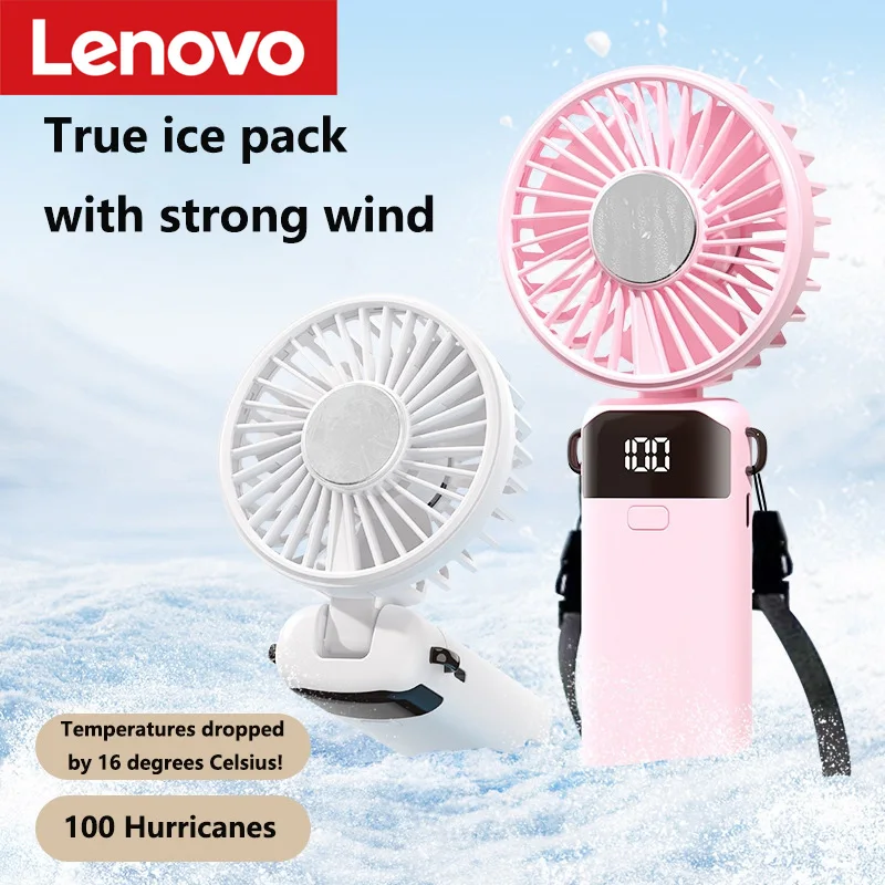 Lenovo draagbare ijskoelventilator, draagbaar, duurzaam, stil, opvouwbaar, op het bureau te plaatsen, om de nek te dragen, mini-koelventilator met digitaal display