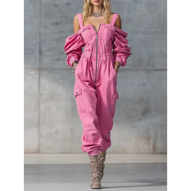 2026 Lente Vintage Denim Jumpsuit Dames Effen Rits Off-shoulder Hoge Taille Losse Cargo Broek Romper Lange Mouwen Overall