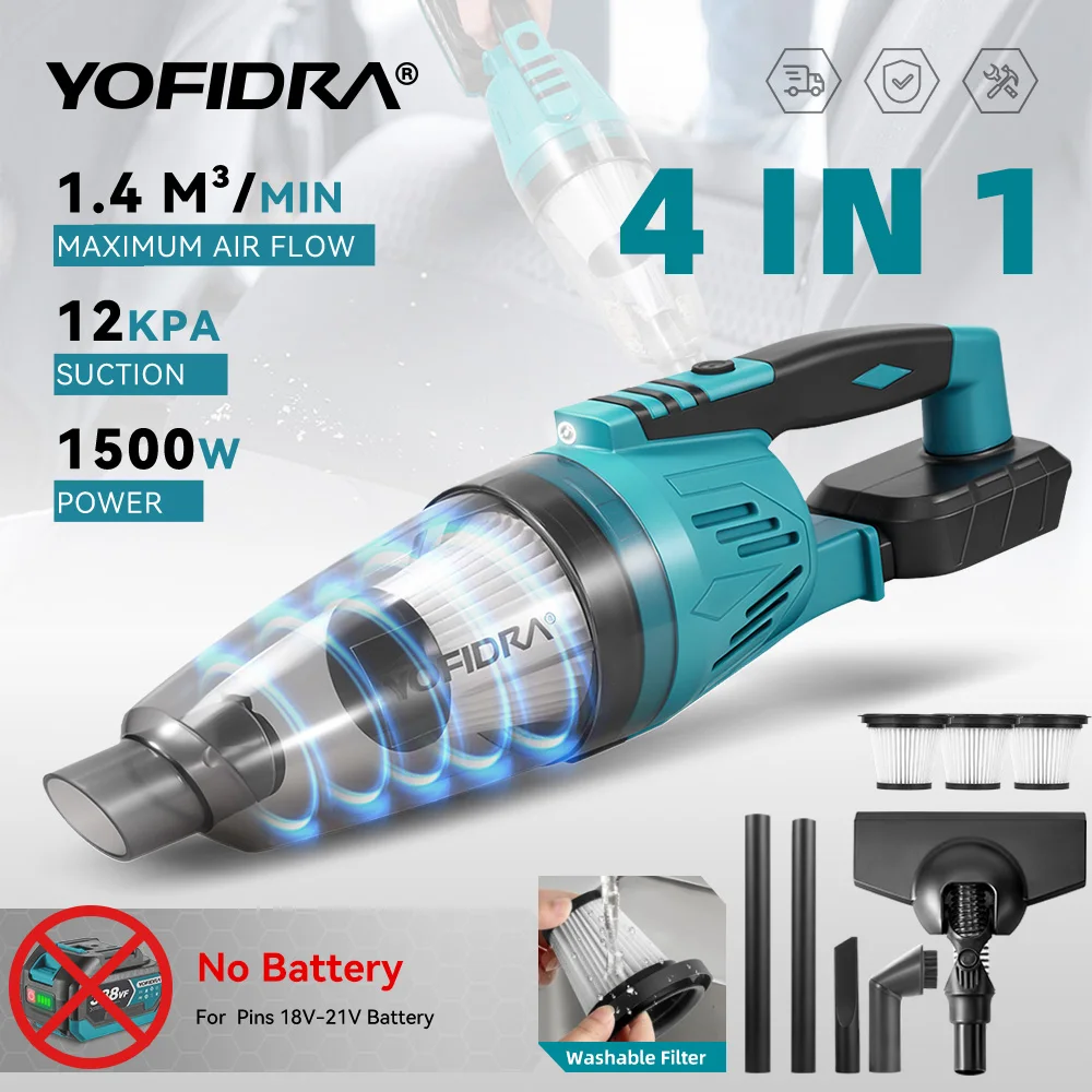 YOFIDRA 1500W 12KPA Elektrische Stofzuiger 4IN1 Draadloze Vacuüm Thuis Auto Schoonmaken Gereedschap met 3 stuks Filter voor Makita Batterij Pin