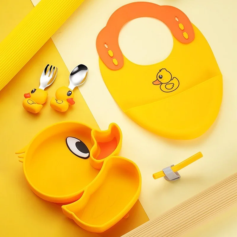Kinder Servies, Food-Grade Siliconen Dinerplaat Baby Anti-Slip, Anti-Vallende Aanvullende Voerbak Baby Vork Lepel Set