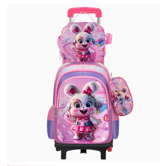 Nieuwe 3D PU lederen rugzak basisschool student nylon 3-delige set kinderrollende rugzak met lunchtas voor meisjes