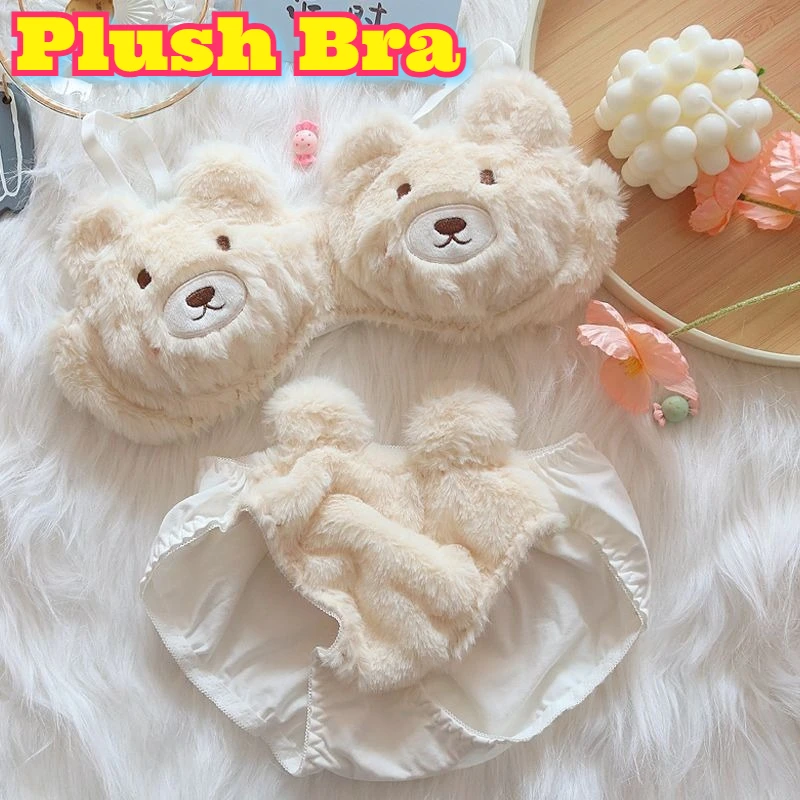 Vrouwen Winter Warm Comfortabel Beugelbeha Set Schattige Kawaii Anime Cartoon Pluche Teddybeer Zachte Gezellige Lingerie Jeugdige Stijl
