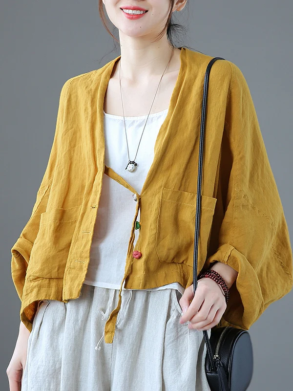 Retro originele vleermuismouw top van katoen en linnen, casual, lichtgewicht, zonwerend, damesmode, lente herfst, losse pasvorm, knoopdesign