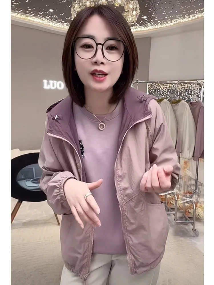 Modieuze casual UV-beschermende jas met capuchon voor dames, zomer 2026, nieuwe kleur, dubbelzijdig te dragen, lange mouwen