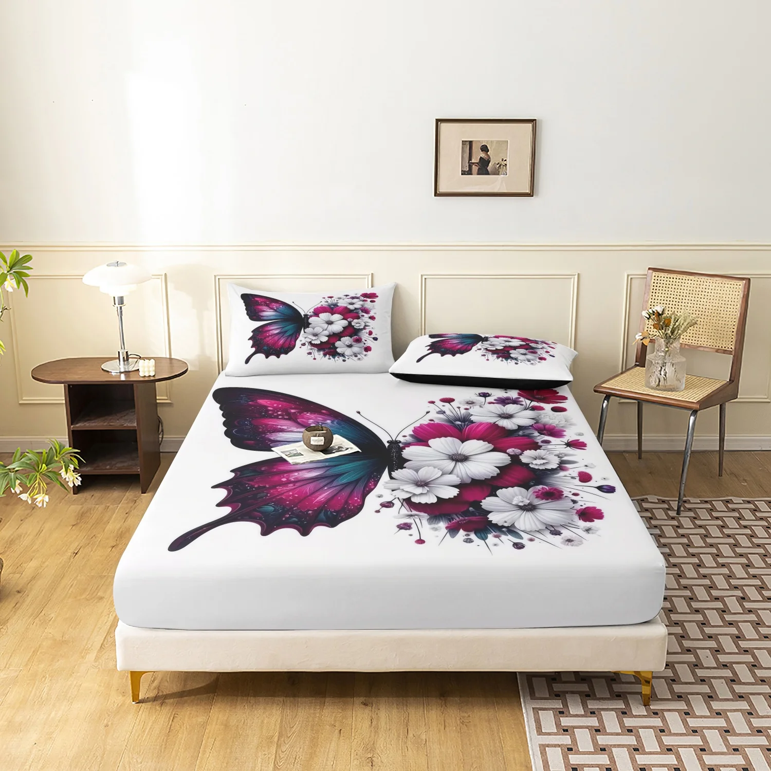 3-delige paarsroze vlinderbloemenprint hoeslakenset, (1 lakens + 2 dekbedovertrekken, geen kussen), geschikt voor familiekamers, hotels