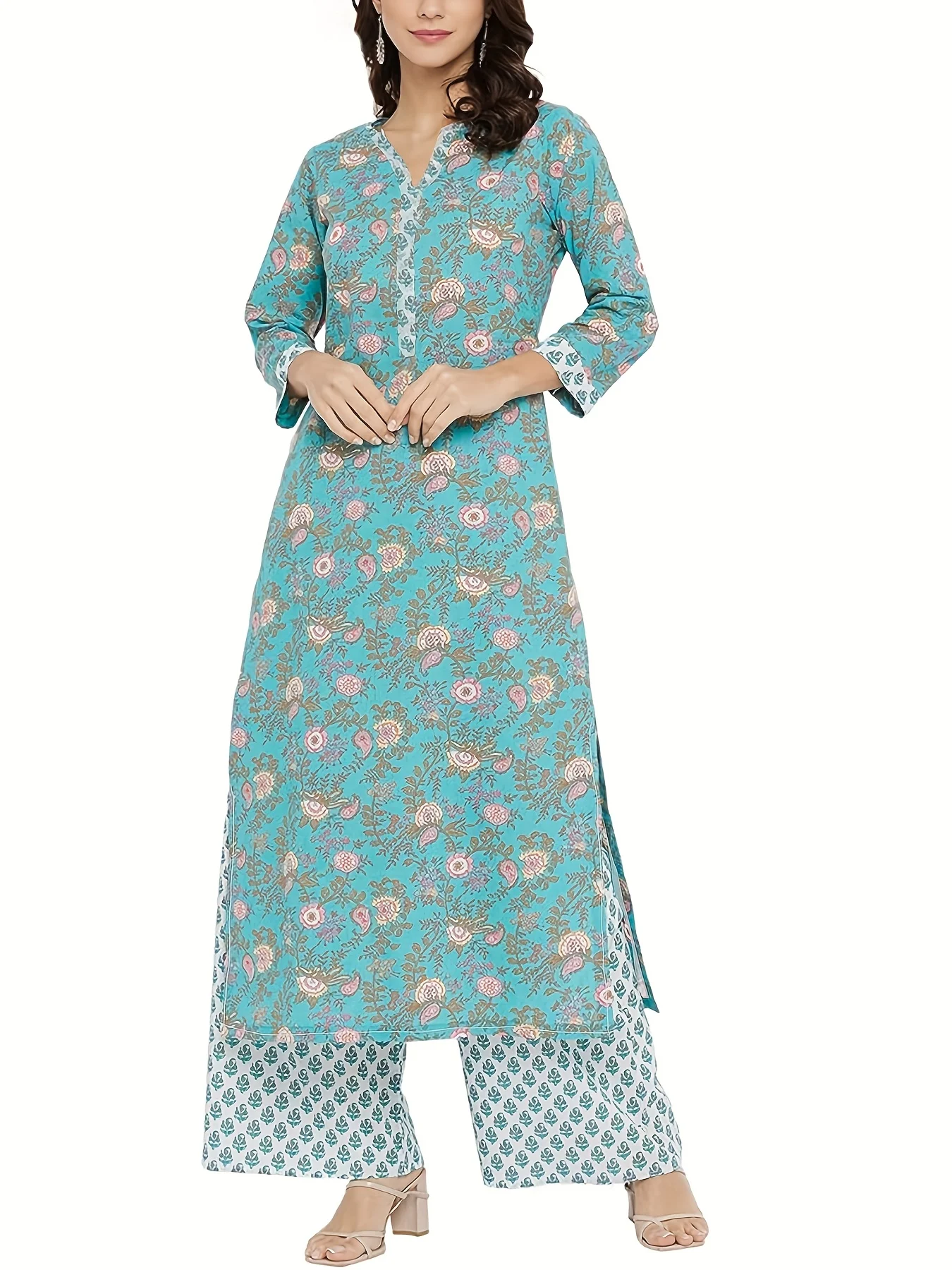 Plus Size Bloemen Kurta Set Geborduurde Top & Palazzo Broek Etnische Outfit Gratis Verzending