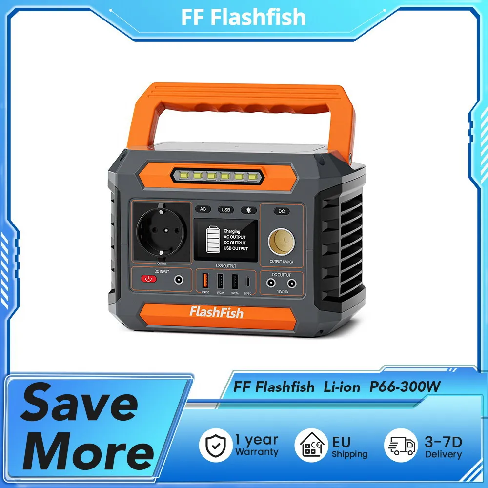 FF Flashfish Li-ion P66-300W, capaciteit 288,6 Wh, 260 W AC continu vermogen, 8 oplaaduitgangen, 5 W draadloos opladen