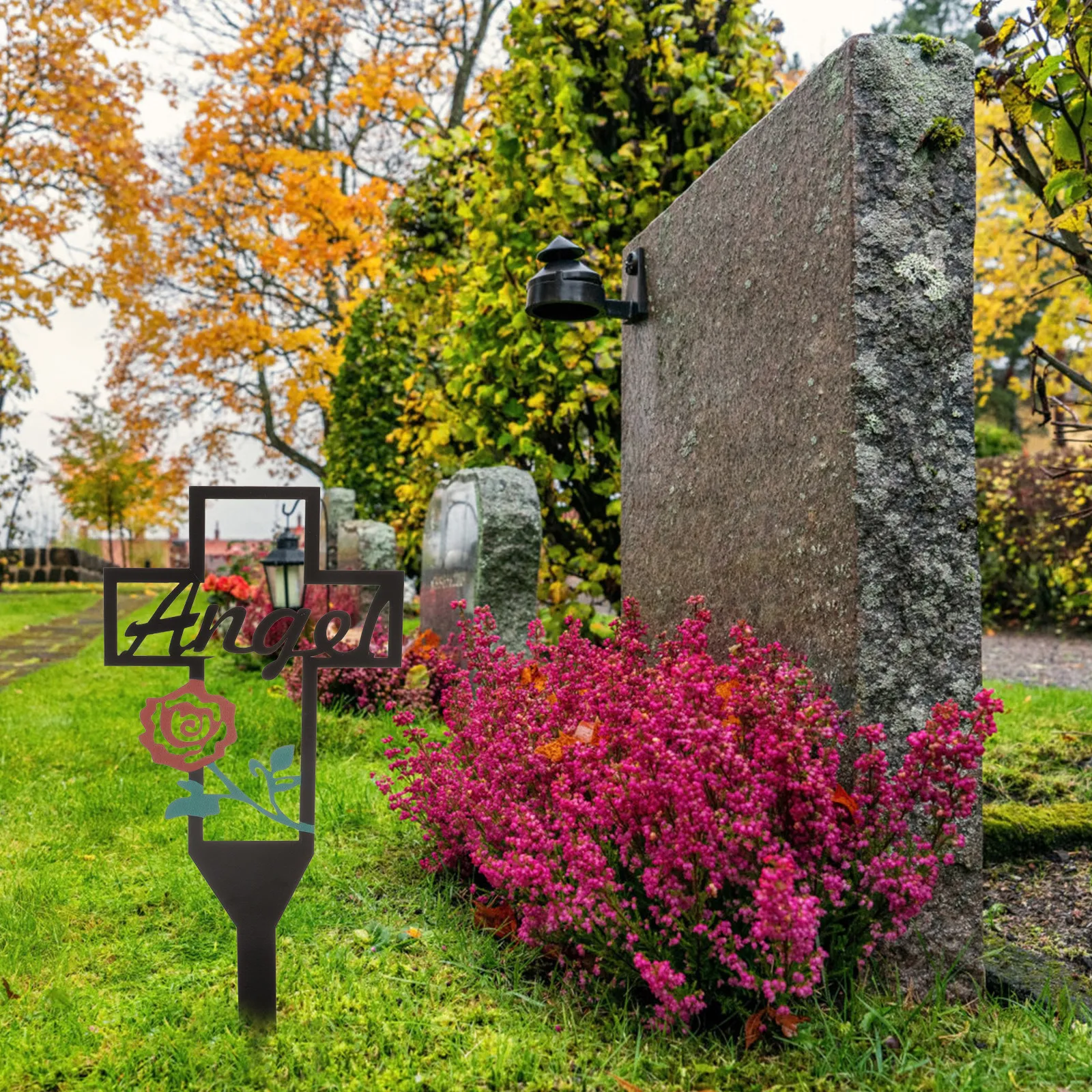 Herdenkingskruispaal, zwaar ijzeren grafmarkering voor begraafplaats en tuin decoratie met rode liefdessymbolen, begraafplaats herdenkingspaal