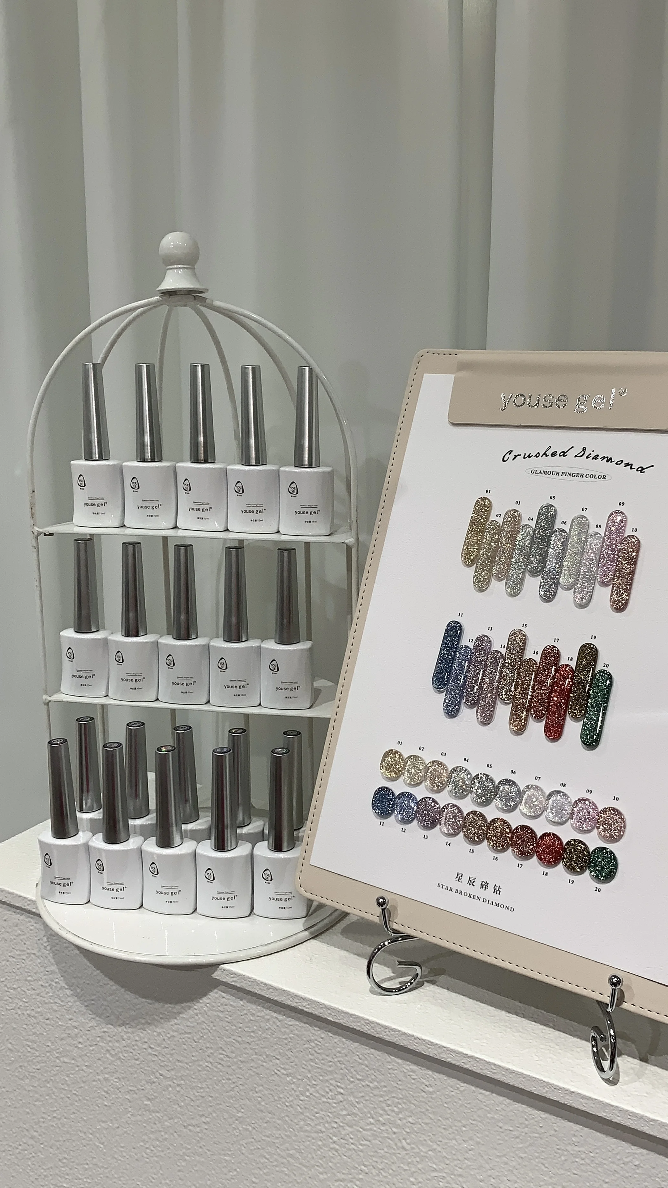 20-kleurige reflecterende gel nagellakset met kleurenkaart. Schattige en elegante nagelkunst, artistieke nagelkunst charme. Salon n