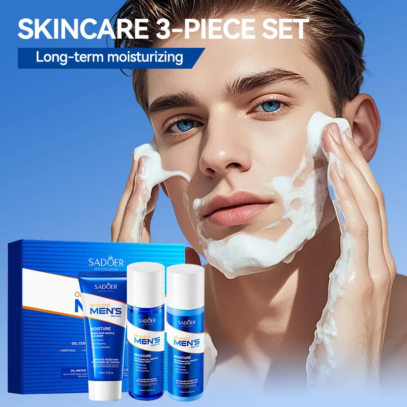 Sadoer Hydraterende, rustgevende oliecontrole 3-delige set voor heren | Diep reinigende, hydraterende en hydraterende huidverzorgingsset | Vocht- en oliebalanscontrole, poriënreductie | Verbetering van ruwe huid en het elimineren van dofheid | Koel gevoel, geen plakkerigheid. | Huidverzorgingsset voor heren