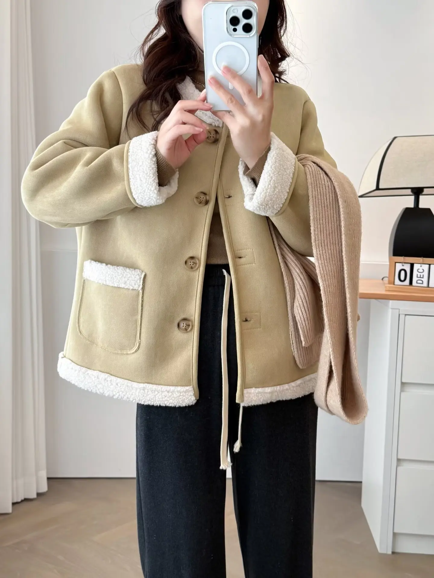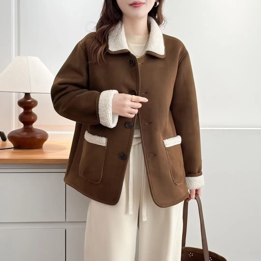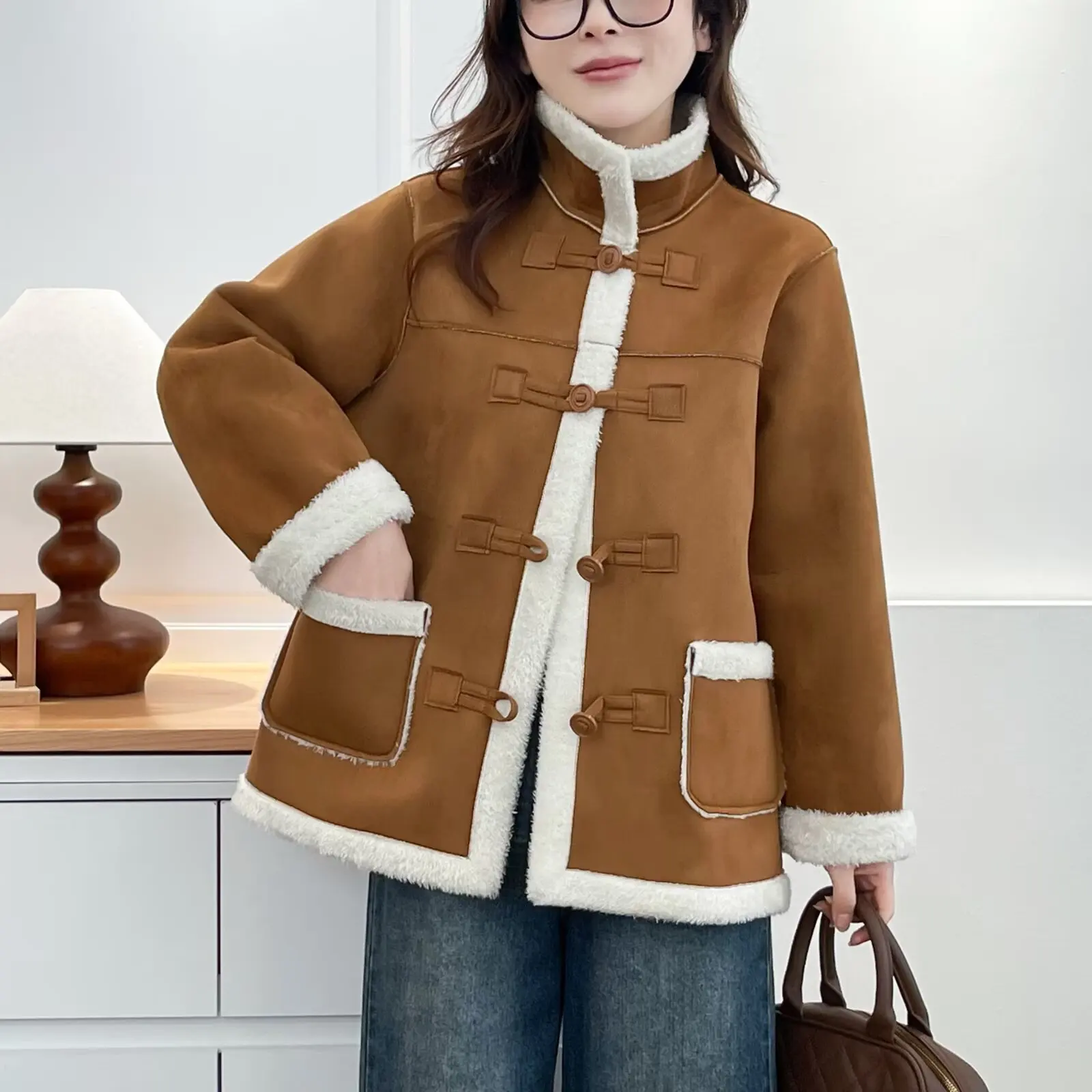 XXXXL Mode Plus Size Dameskleding Suède Jas Winter Nieuwe Retro Knop Fleece En Verdikte Warme Opstaande Kraag Bovenkleding 2528