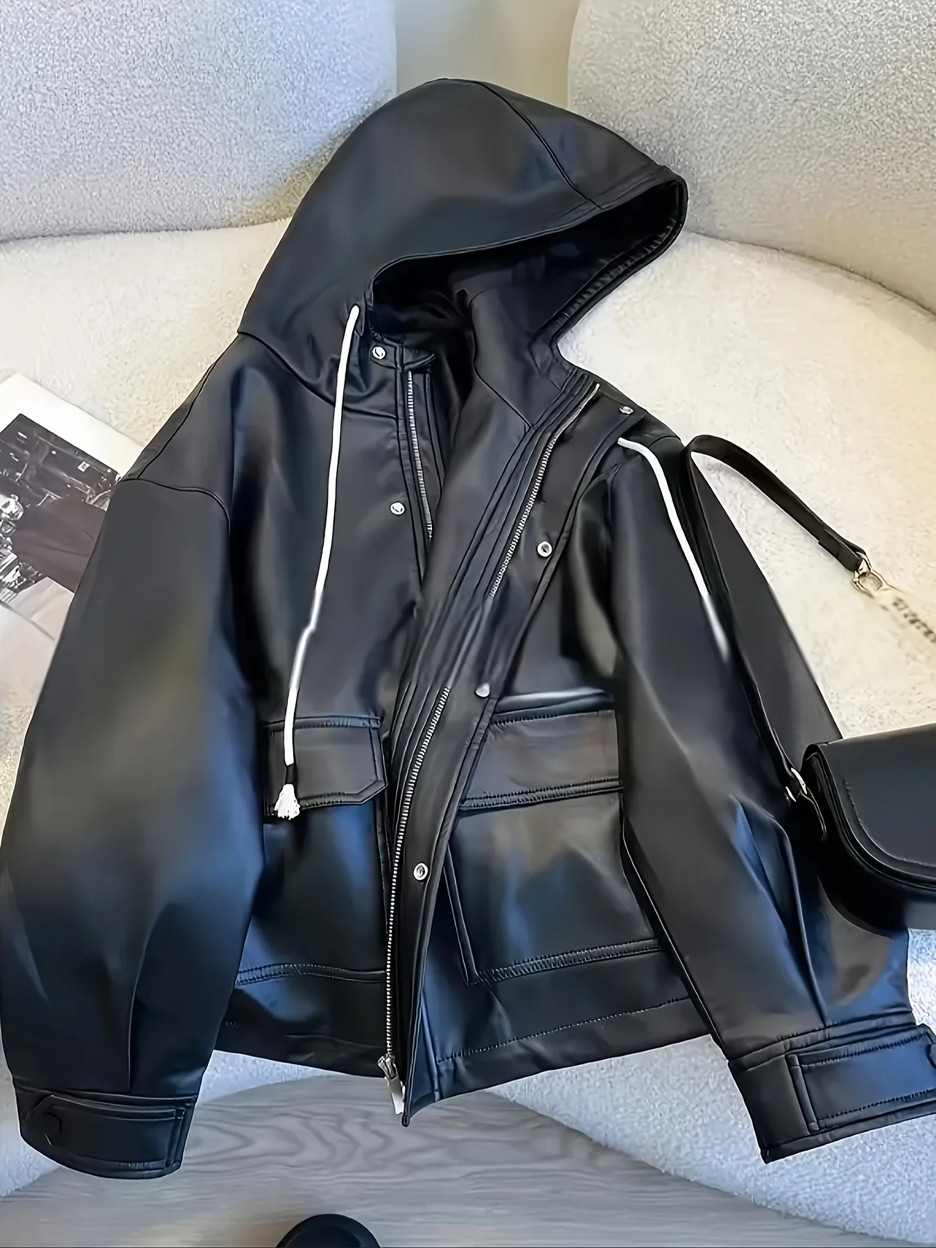 plus maat zwarte leren jas in motorfietsstijl met capuchon, damesmode, veelzijdige leren jas