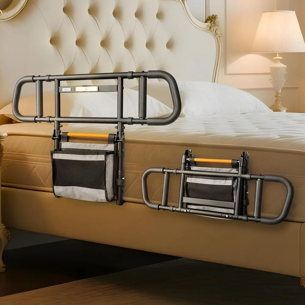 Opvouwbare opsta-hulp voor senioren, met aan beide zijden verstelbare handgrepen, en LED-sensorlamp.