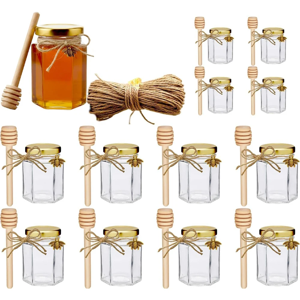 Zeshoekige honingpotten van glas met gouden deksels, houten lepeltjes, bijenhangers en jute - Zeshoekige potten voor babyshowers, bruiloften