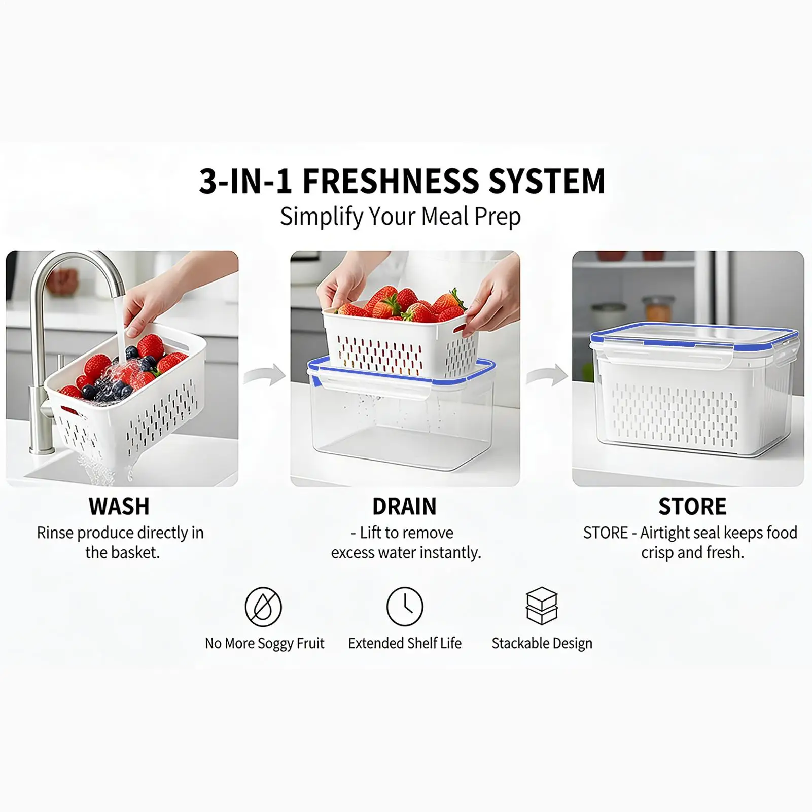 4-in-1 voedselbewaarcontainer 4-in-1 transparante lekvrije containers met verwijderbare vergiet voor fruit- en groentebewaring