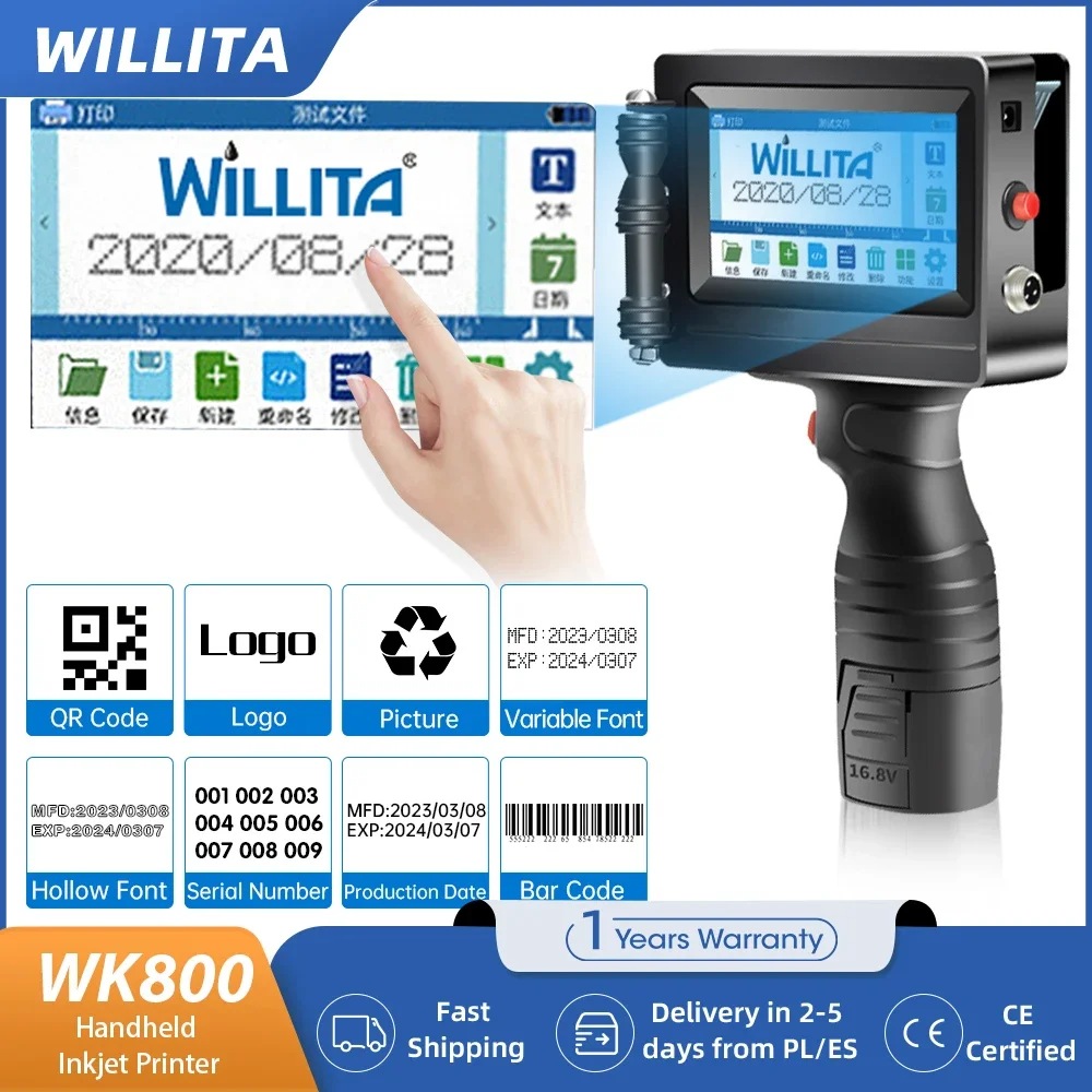 WILLITA WK800 Draagbare Handheld Inkjetprinter Datum Batchnummer Logo Afbeelding Tekst Barcode QR-code 12,7 mm Inkjet Codeermachine