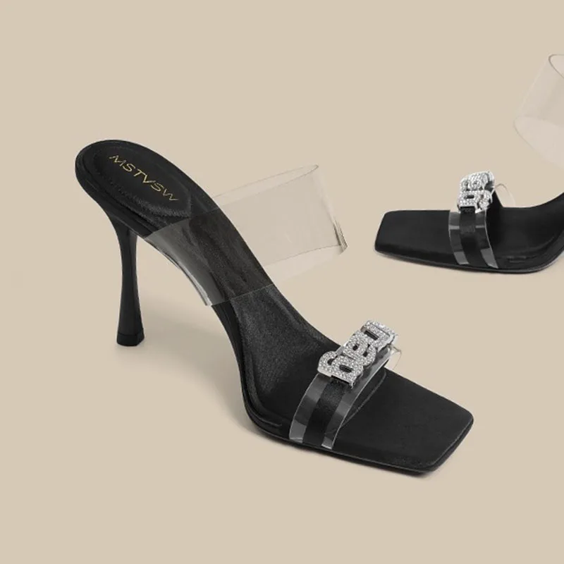 Transparante hoge hak sandalen dames zomer buiten sexy diamant brief gezellige kamer platte kop blauwe slippers EVA materiaal PVC...