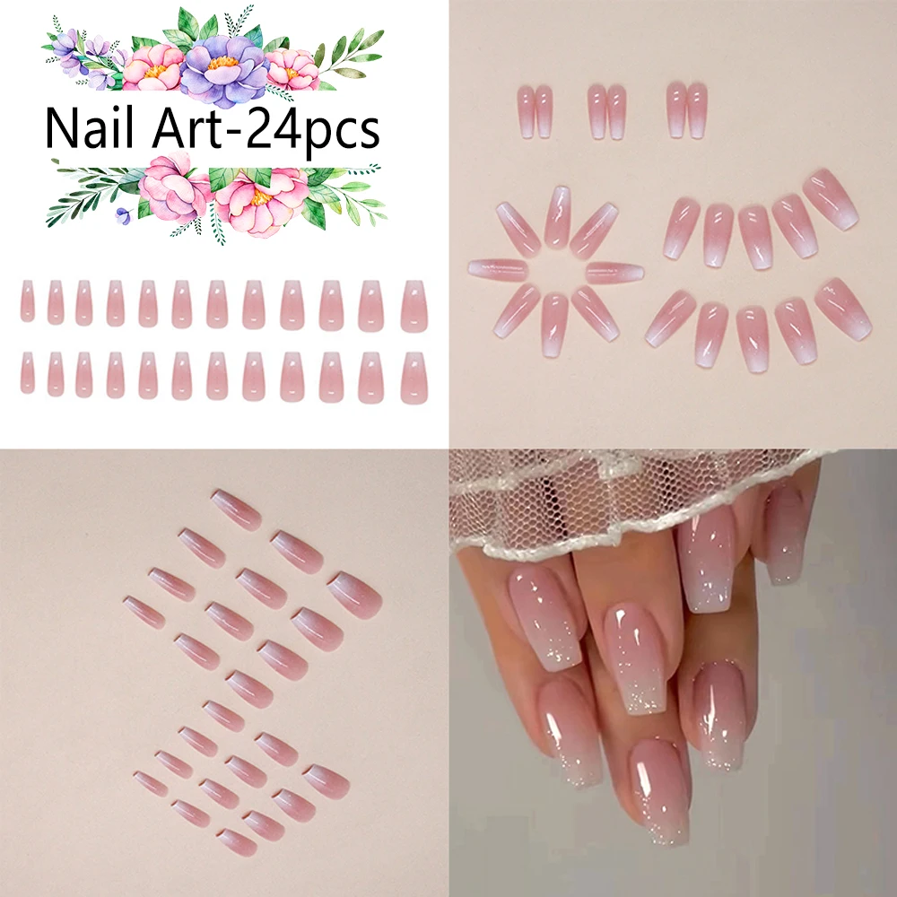 Franse stijl lange doodskist kunstnagels kunst roos met lijm draagbaar naakt roze witte kleur jelly nagels tips volledige dekking druk op nagel
