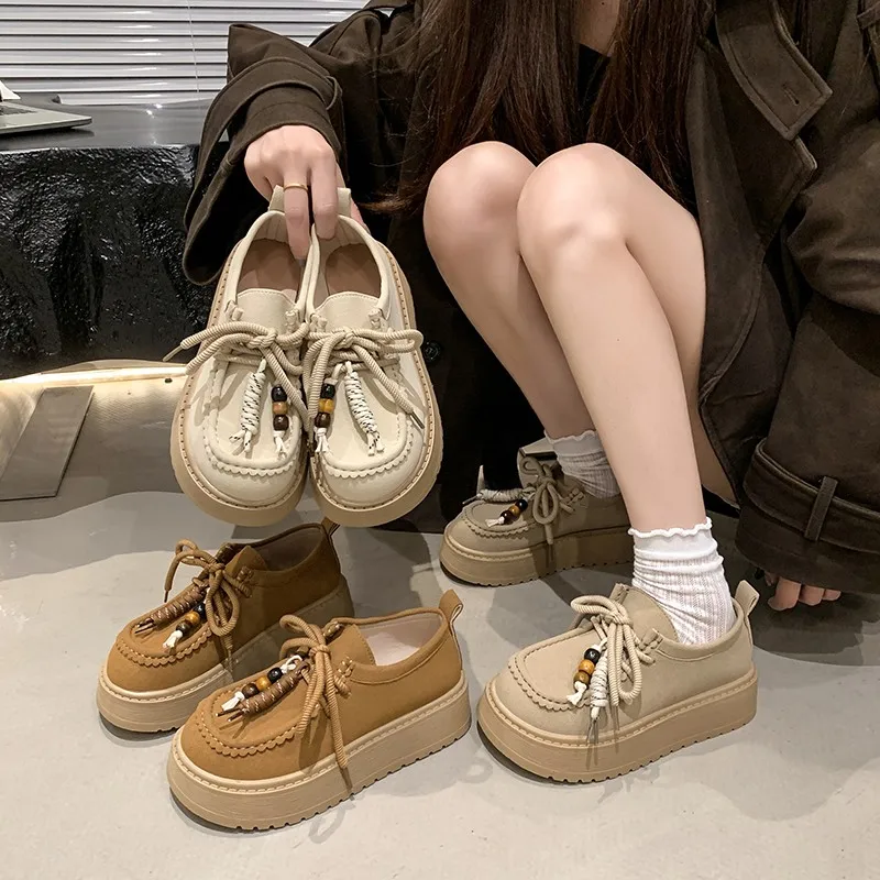 Lente Herfst Koe Suede Slippers Vrouwen Ronde Neus Muilezels Schoenen Vrouw Platte Slides Metalen Gesp String Bead Comfort Slippers Vrouw