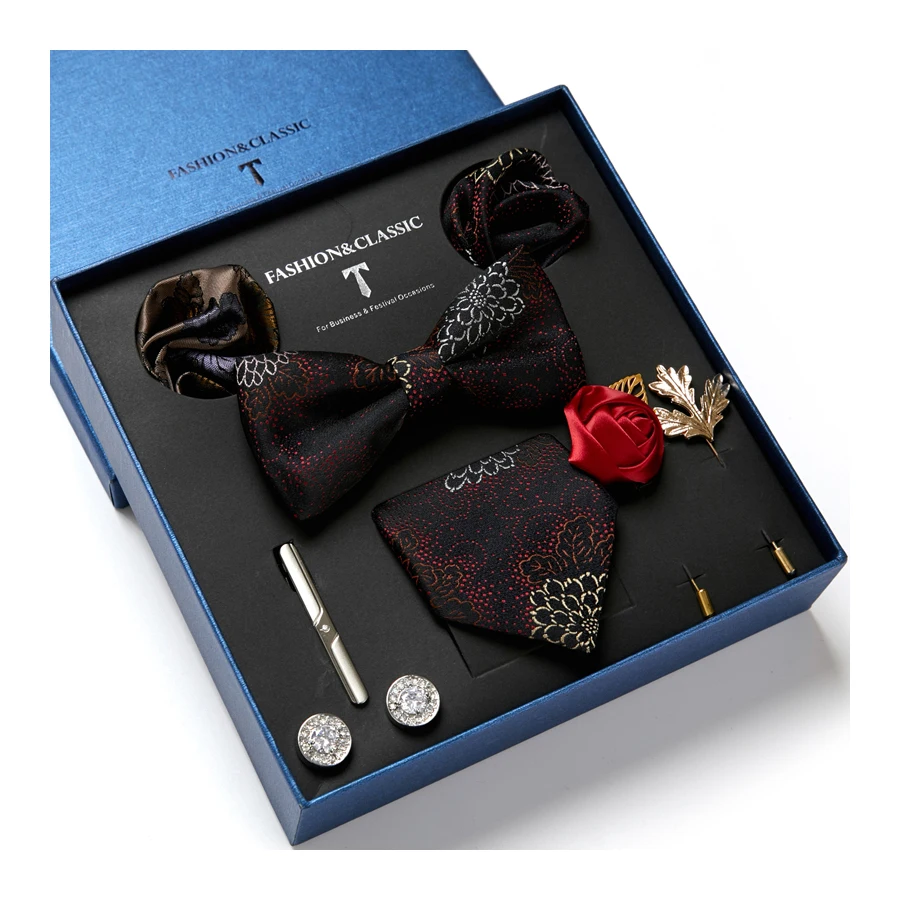 Een luxe cadeauverpakking met een set uitgebreide en luxueuze herenstropdassen en -vliegers, geschikt voor jubilea, bruiloften en feestdagen.