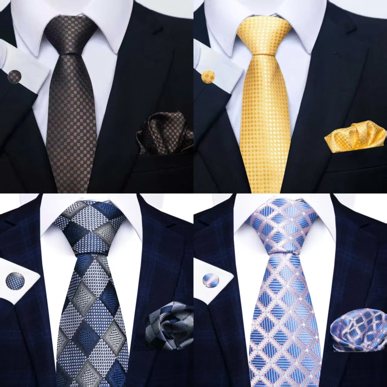 Geruite herenstropdas, zakdoek en manchetknopen, 3-delige set, geschikt voor zakelijke gelegenheden, banketten en andere pakcombinaties