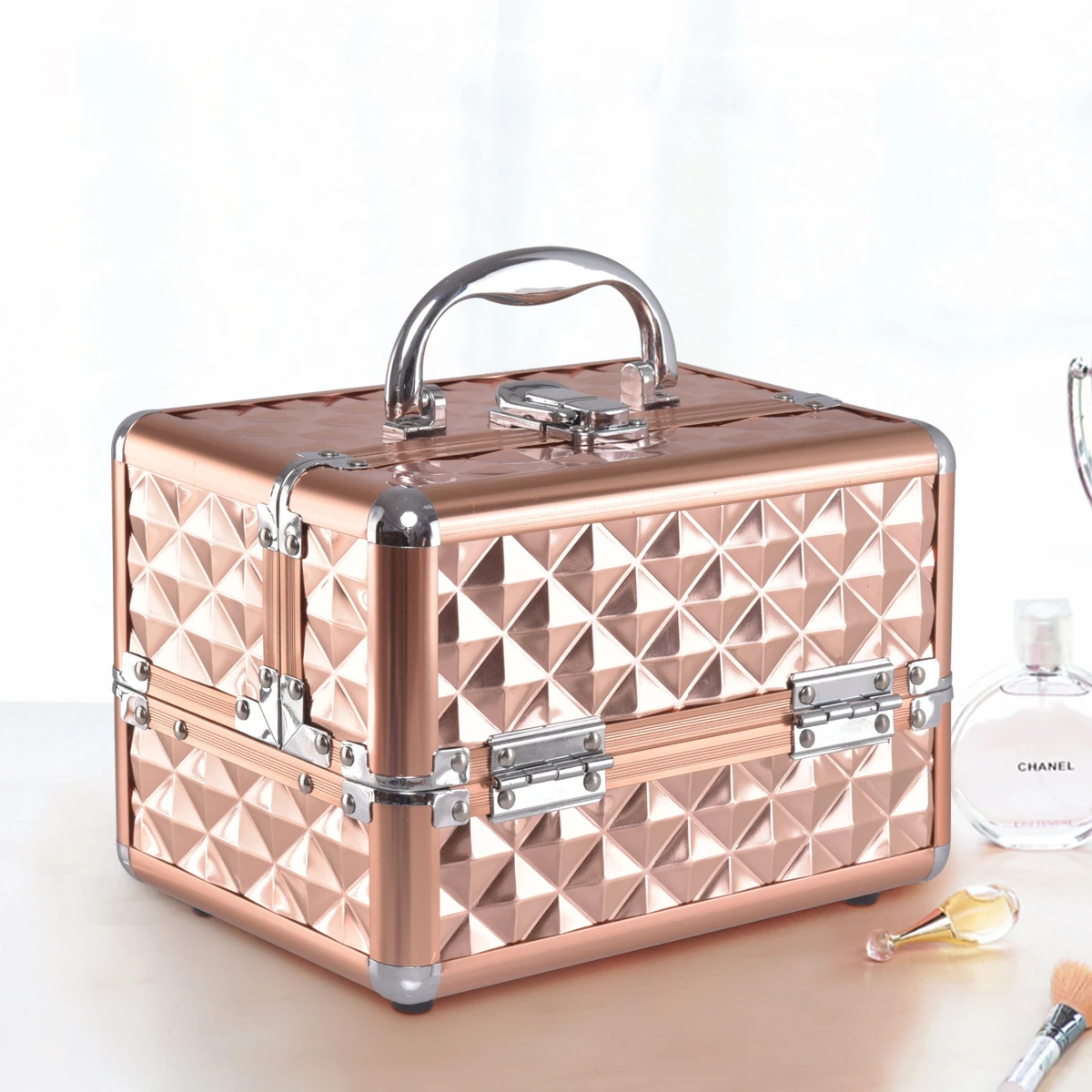 Aluminium make-up koffer met 2 uittrekbare laden & ingebouwde spiegel, organizer met handvat, stofdichte opbergbox voor beautysalon, thuis & reizen