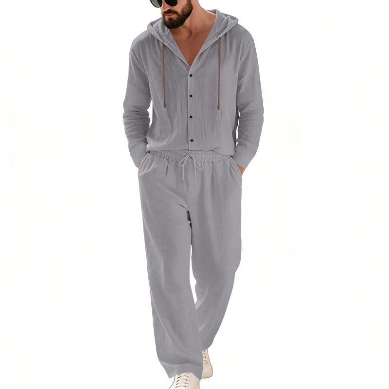 Linen casual herenshirt met capuchon, rechte broek, tweedelige set, lente/zomer strandvakantiekleding