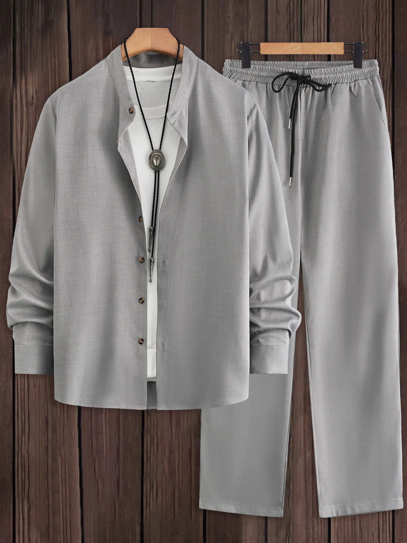 Heren 3-delige waffle gebreide trainingspak | Overhemd met geruite bies en knoopsluiting & set met elastische taillebroek en -broekje | Casual stijlvolle outfit voor