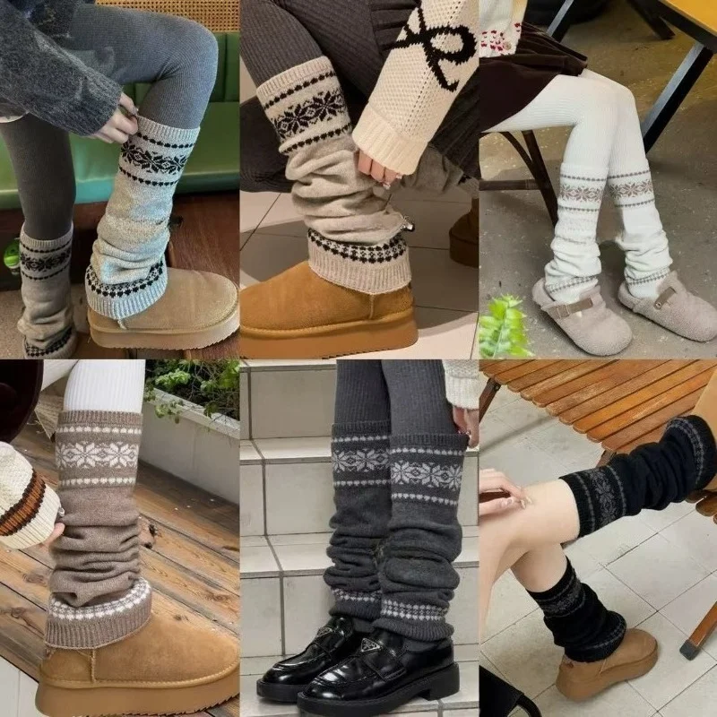 1/6 paar Fair Island herfst/winter retro art gestapelde sokkenset grof gebreide sneeuwvloklucht dunne warme grijze beenbedekking