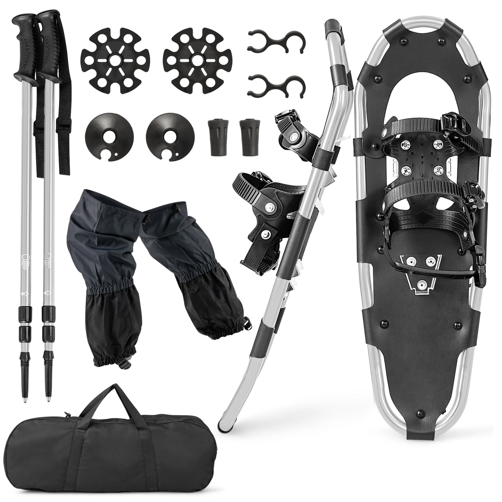 Veelzijdige sneeuwschoenenset voor elk terrein, 53 cm sneeuwschoenen met dubbel-ratelbindingssysteem, aluminium frame, trekkingstokken