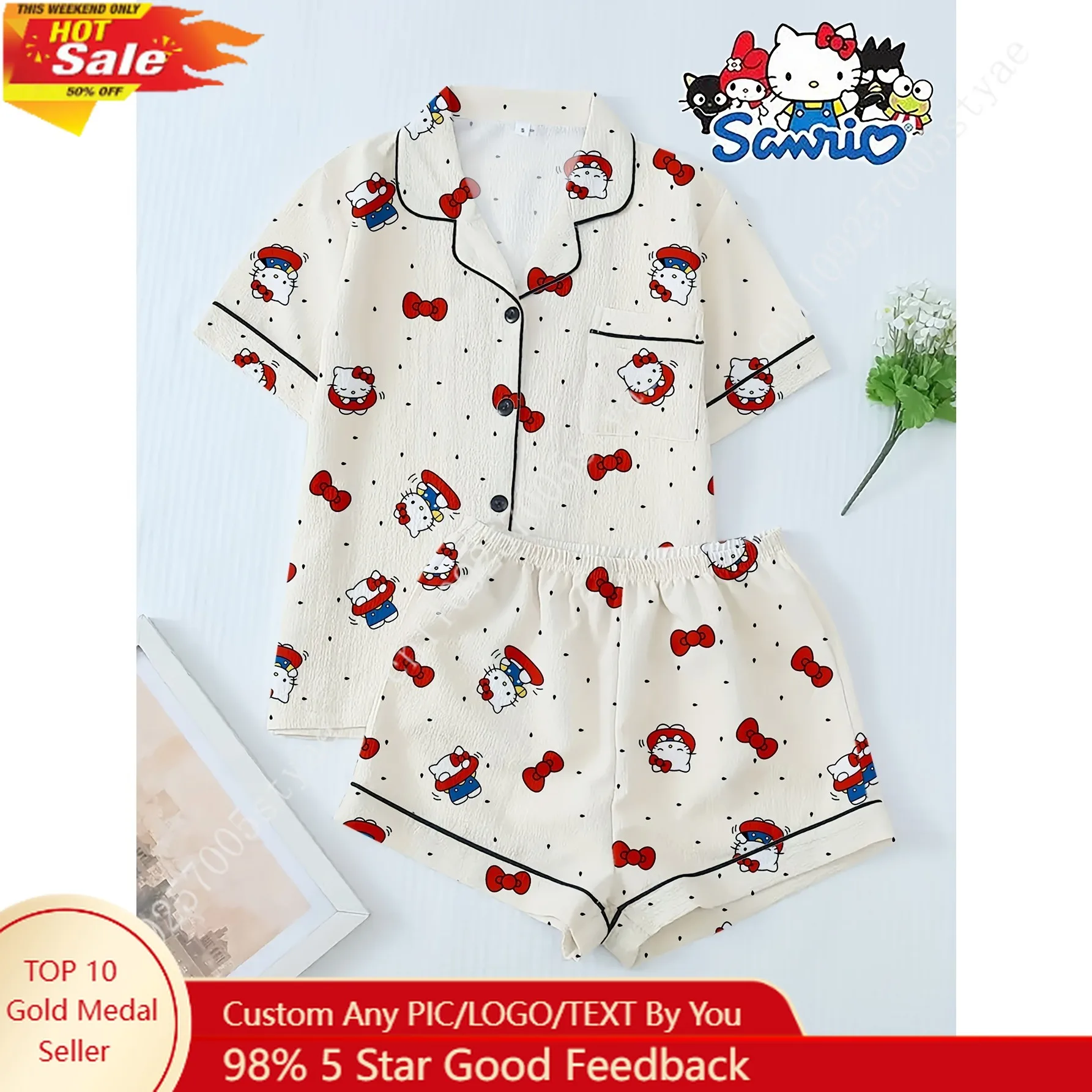 Sanrio HELLO KITTY Gedrukte Pyjama Tweedelige Set 1pc Top 1 Shorts Revers Dichtgeknoopt Vest Thuispak Zachte Pj Set