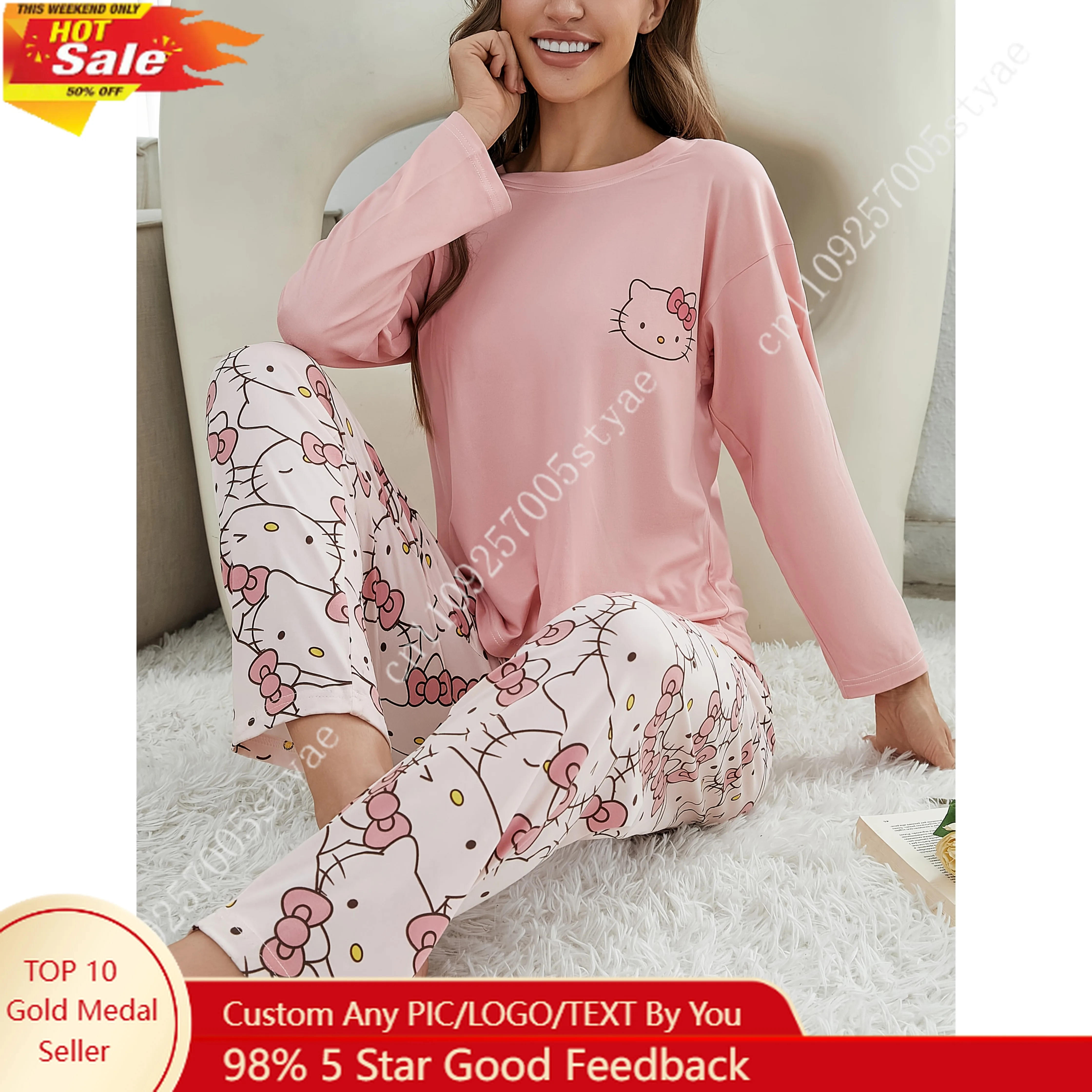 2-delige Sanrio Hello Kitty pyjamaset met een haltertop voor dames, off-the-shoulder stijl en zwarte broek