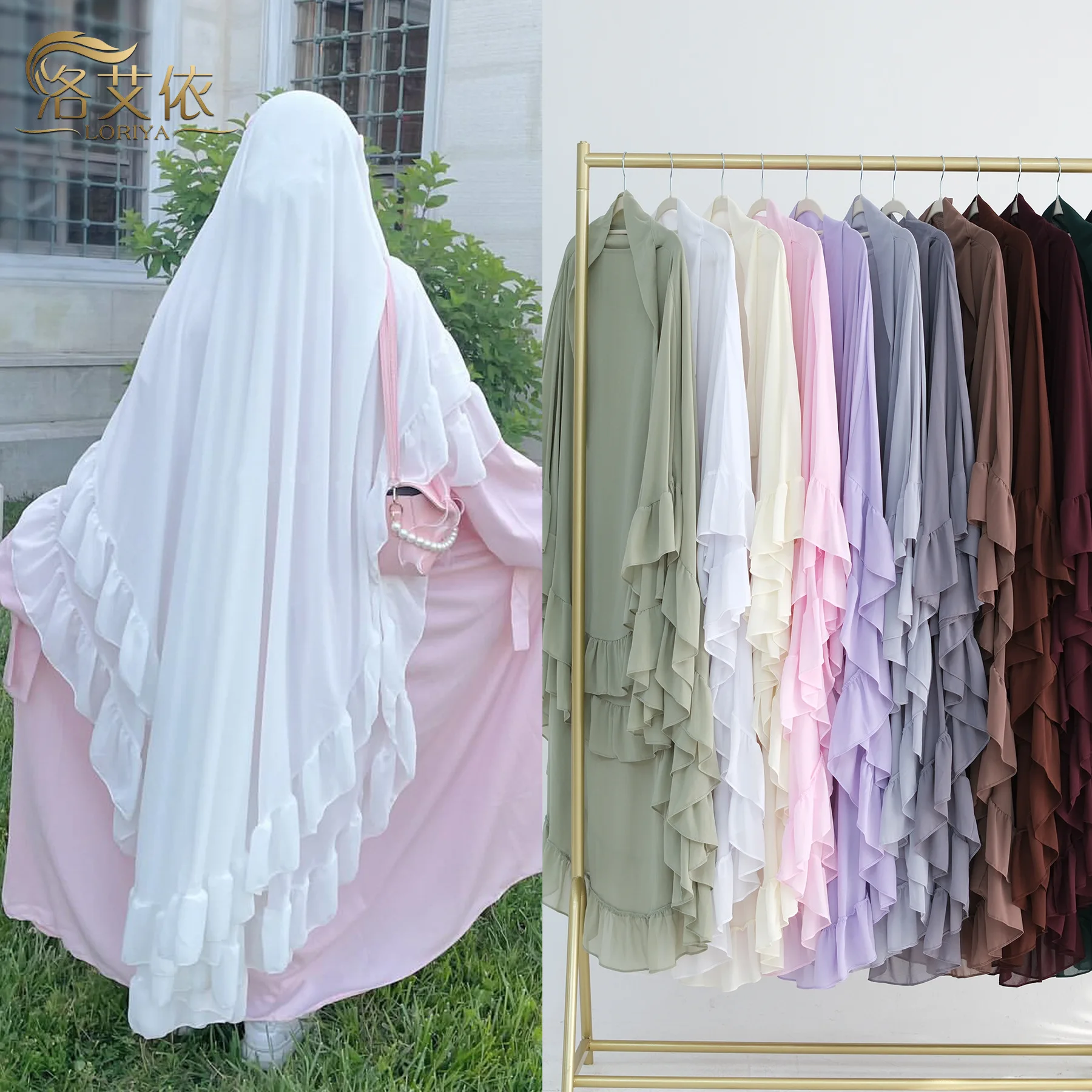Dubbellaagse hoofddoek met ruchesrand, grote swing-stijl, Midden-Oosten, effen kleur, grote hoofddoek HJ926